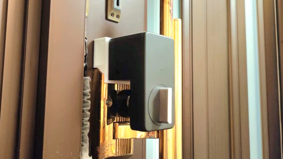 貼り付け完了後の様子。白いのが私が作った土台です まず、両面テープを剥がす前に、取り付け予定の場所に取り付けられるかを確認します。片手でSwitchBotロックを固定し、もう片方の手で手動でサムターンを回し、スムーズに回ればOKです。OKなら、取り付ける部分を付属のウェットティッシュで拭き、両面テープを剥がして貼り付けます。このとき、しっかりと接着させるために最低でも2分以上は力を加え続けます。